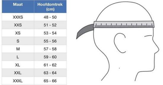 Er zijn verschillende maten helmen beschikbaar. Het is van belang dat u een helm kiest met een goede maat, zodat deze perfect op het hoofd aansluit. Wanneer een helm te los op het hoofd zit, zal dit de bescherming aanzienlijk verminderen. De maten lopen uiteen van XXXS tot en met XXXL. Dit houdt een omtrek in variërend van 48 tot en met 66 centimeter en kan opgemeten worden met een meetlint. Voor kinderen zal de omtrek liggen tussen 48 en 52 centimeter. Let er bij het opmeten op dat het meetlint 2 centimeter boven de wenkbrauwen wordt gehouden.